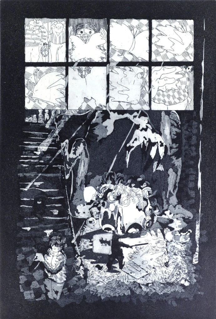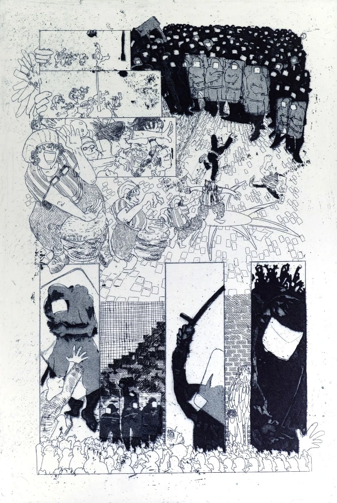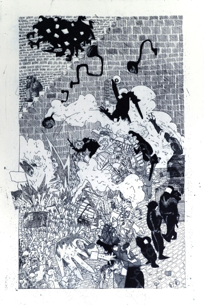 La ville bleue est une histoire gravée sans texte retraçant l’histoire d’un enfant qui échappe à la garde de ses parents en poursuivant un papillon et qui se perd dans une manifestation. Il y fera la connaissance d’un guide qui l’accompagnera dans son périple, au cœur de l’insurrection.